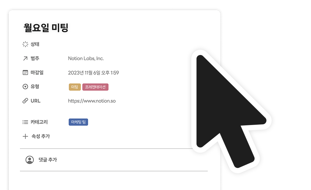 주제는 강력한 문서정리 서비스 노션(Notion)의 30초 모션그래픽 소개영상이며 UI 요소가 마우스 포인터를 중심으로 자연스러운 화면전환과 함께 움직이는 방식으로 제작했다.
