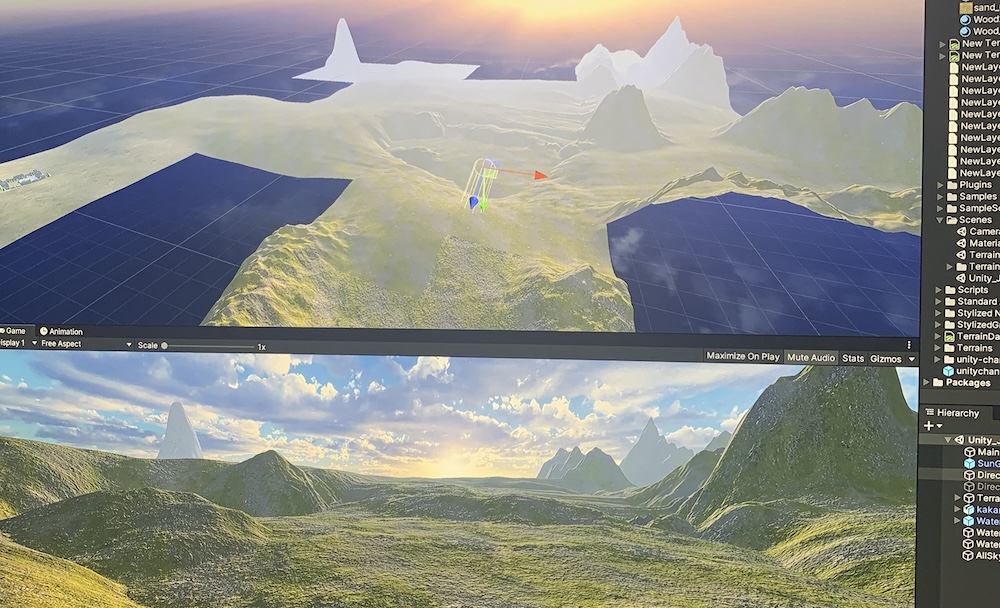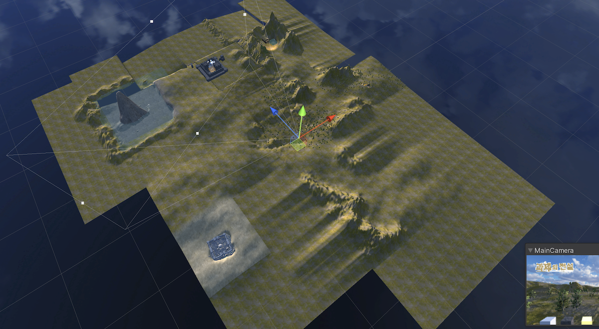 터레인(Terrain)을 구성할 때 넓은 평원과 산맥을 구역별로 다르게 구성하였고 각 구역마다 특색있는 오브젝트 배치로 평원을 돌아다닌다는 느낌이 들게 하였다.